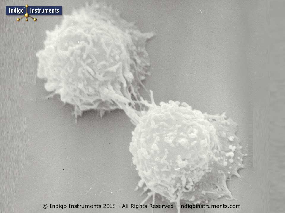 This image shows the final stages of cell division where the 2 "daughter" cells produced during mitosis separate.