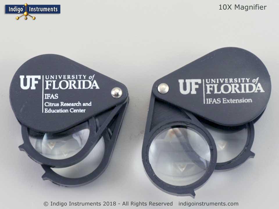 This simple folding magnifier is an essential tool in integrated pest management. The image of this 10X plastic loupe magnifier shows 2 different logos done in white ink for state university crop research and agricultural pest control programs.