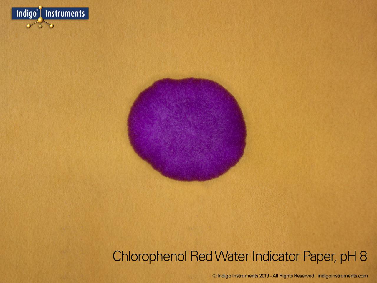 Chlorophenol red detection paper is pH sensitive & in this image shows strong contrast when the water pH is 8 or even higher alkalinity. See other images below to compare results at different pH levels.